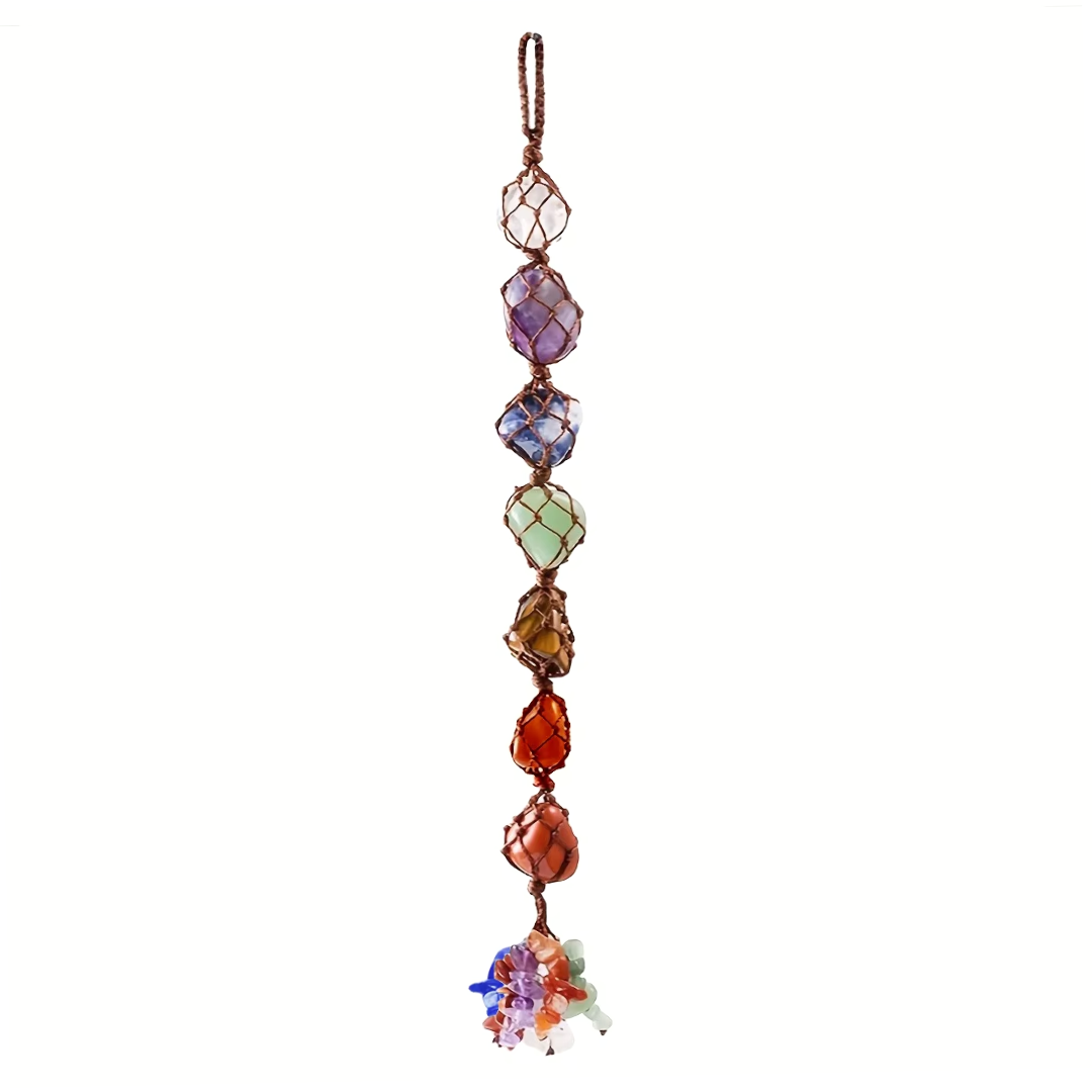 This beautiful handmade ornament is designed to align and balance the seven chakras, promoting physical, emotional, and spiritual well-being. Crafted with natural gemstones, each stone corresponds to a specific chakra, wrapped securely in braided copper wire for durability and elegance.