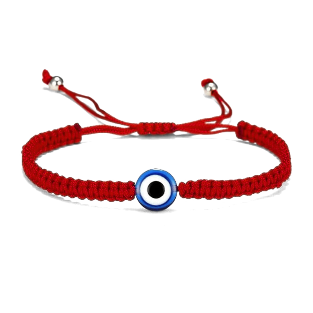 - Material: Durable woven red cord with a glass Evil Eye bead