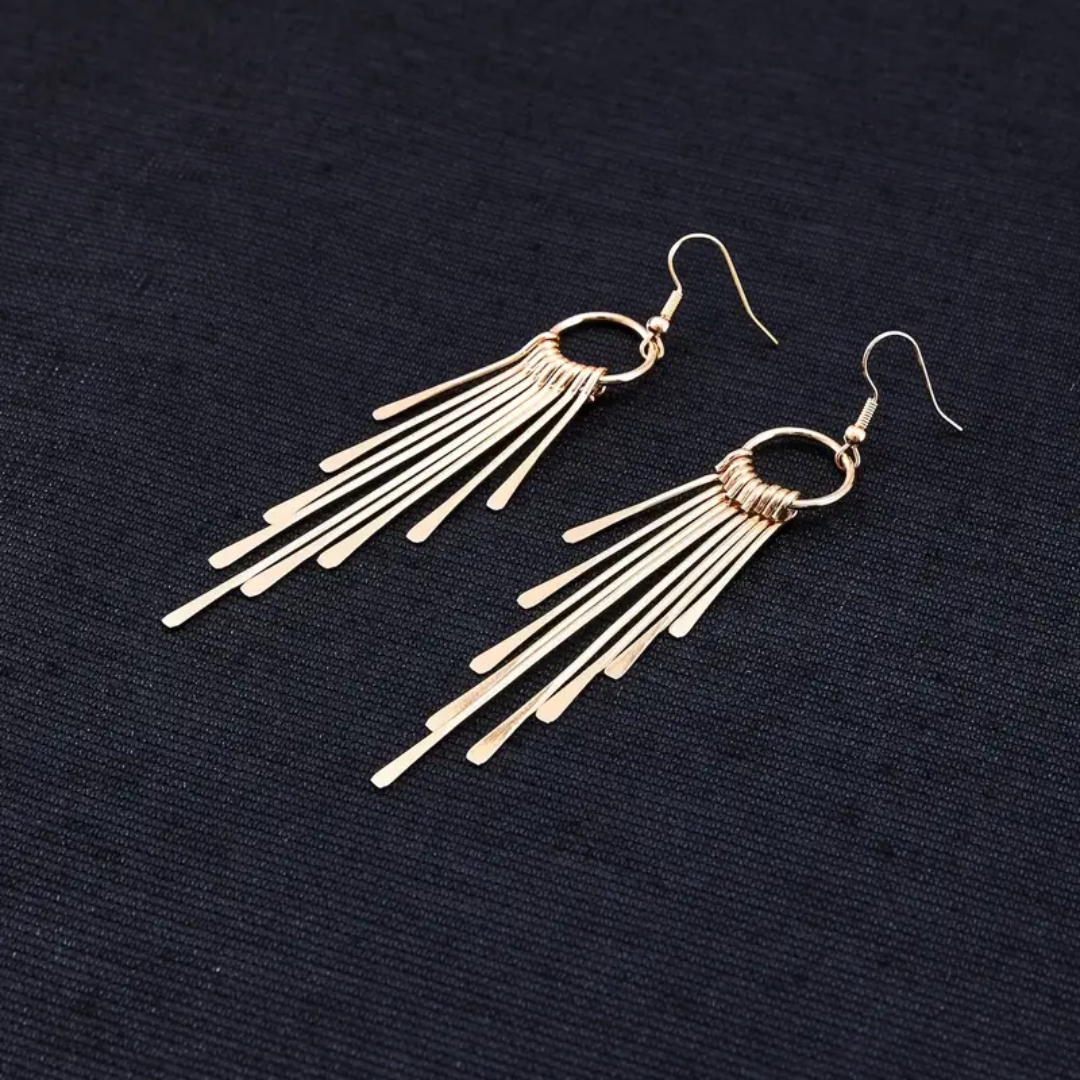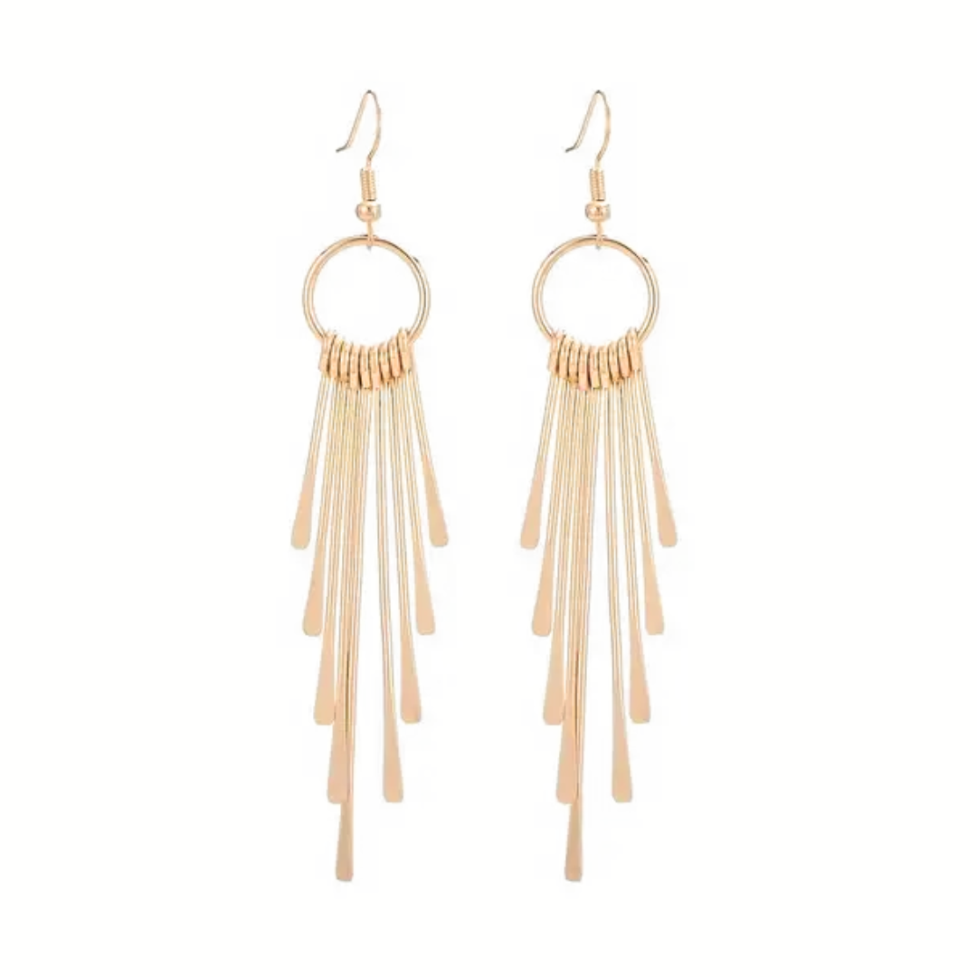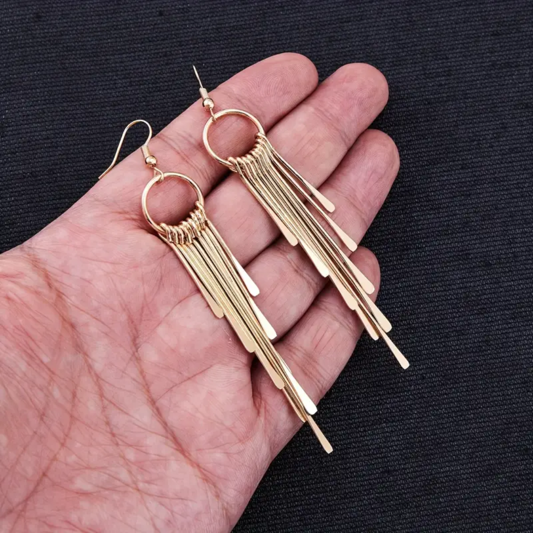 Embrace the mystical energy of the Golden Circle Tassel Dangle Earrings, a boho-chic talisman for those who walk between worlds. At the heart of these earrings lies a radiant golden circle, symbolizing unity, wholeness, and the eternal cycle of life. From the circle, delicate golden tassels cascade like beams of sunlight, swaying with every movement to create a mesmerizing flow of energy. These earrings are more than just a statement; they are a wearable charm, channeling the power of the sun and the magic of sacred geometry. Perfect for free spirits and modern-day mystics, they invite you to shine with divine radiance wherever you go.