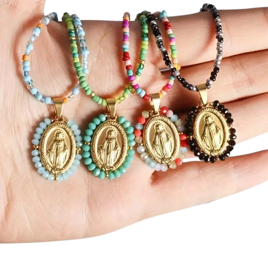 The beaded chains, vibrant and intricate, weave a tapestry of colors that tell a story of devotion. At the heart of these enchanting necklaces lies a golden medallion with two faces of divine reverence. On one side, the serene image of the Virgin Mary radiates wisdom and tranquility, providing a sense of peace and protection. On the other side, the symbol of the Three Marys—figures of faith and resilience—embodies the strength and unity of the sacred feminine.