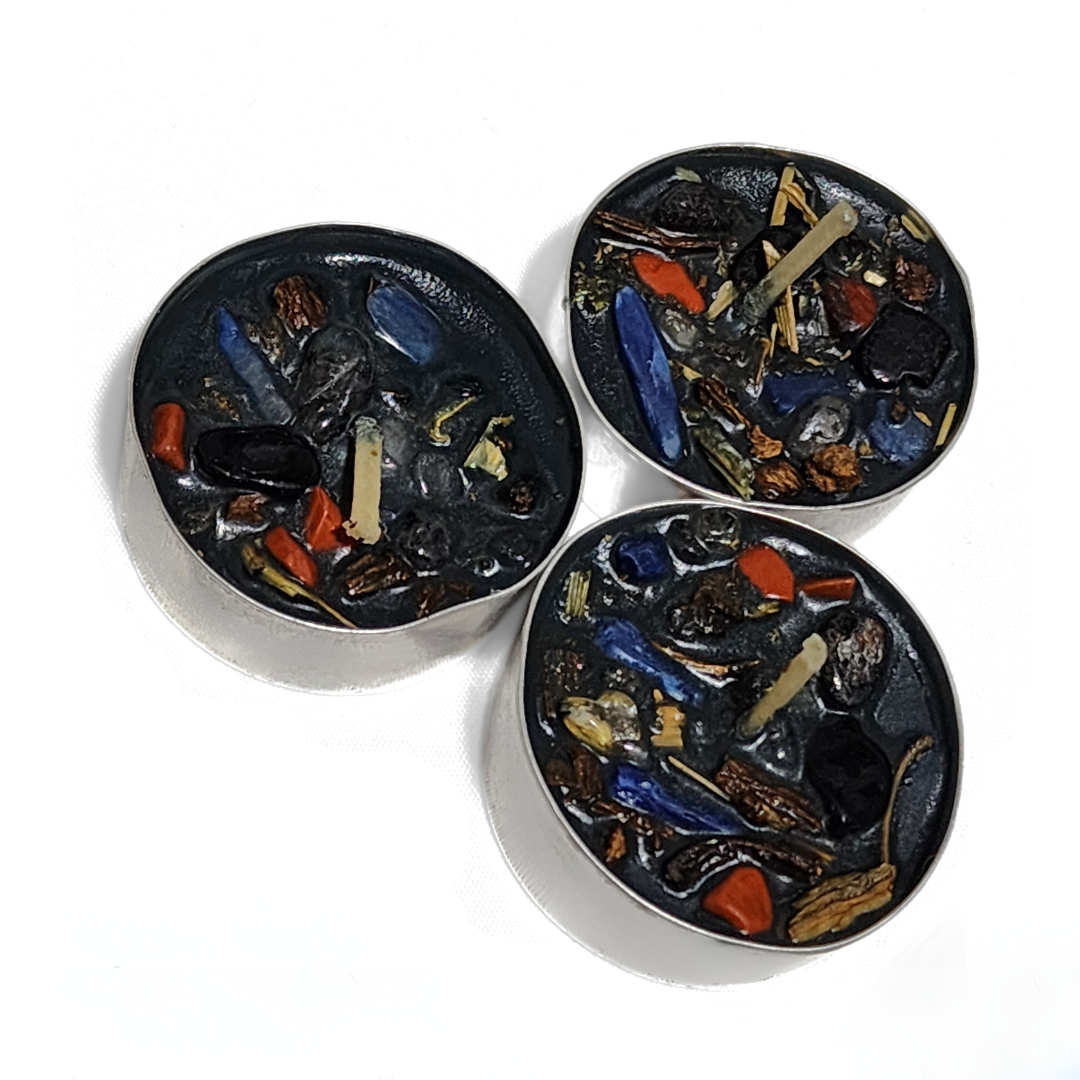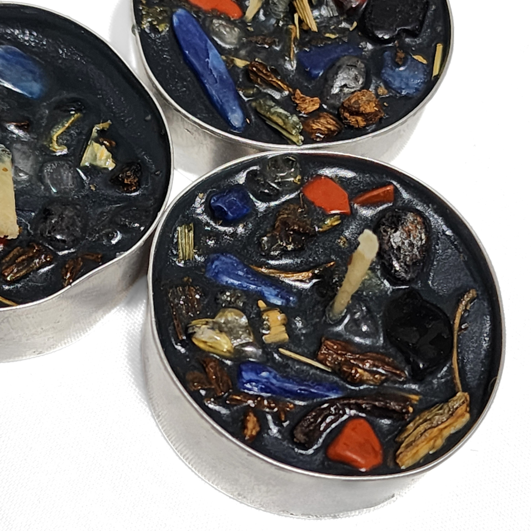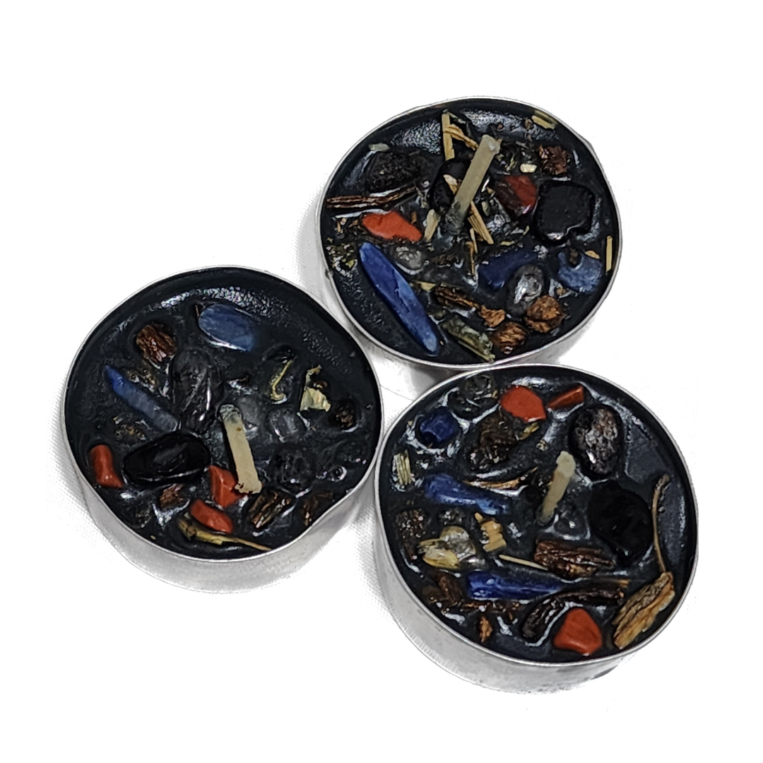 The Banishment Prepared Tea Light by The House of Ashé is a powerful tool for removing negativity, breaking unwanted ties, and clearing stagnant or harmful energy. Crafted with black wax, symbolizing banishment and protection, this tea light is infused with a warm semi-sweet scent to balance the intensity of its energy work. It is dressed with a potent combination of Obsidian, Kyanite, Lepidolite, Smoky Quartz, and a blend of carefully selected herbs, making it an essential addition to your spiritual practice.