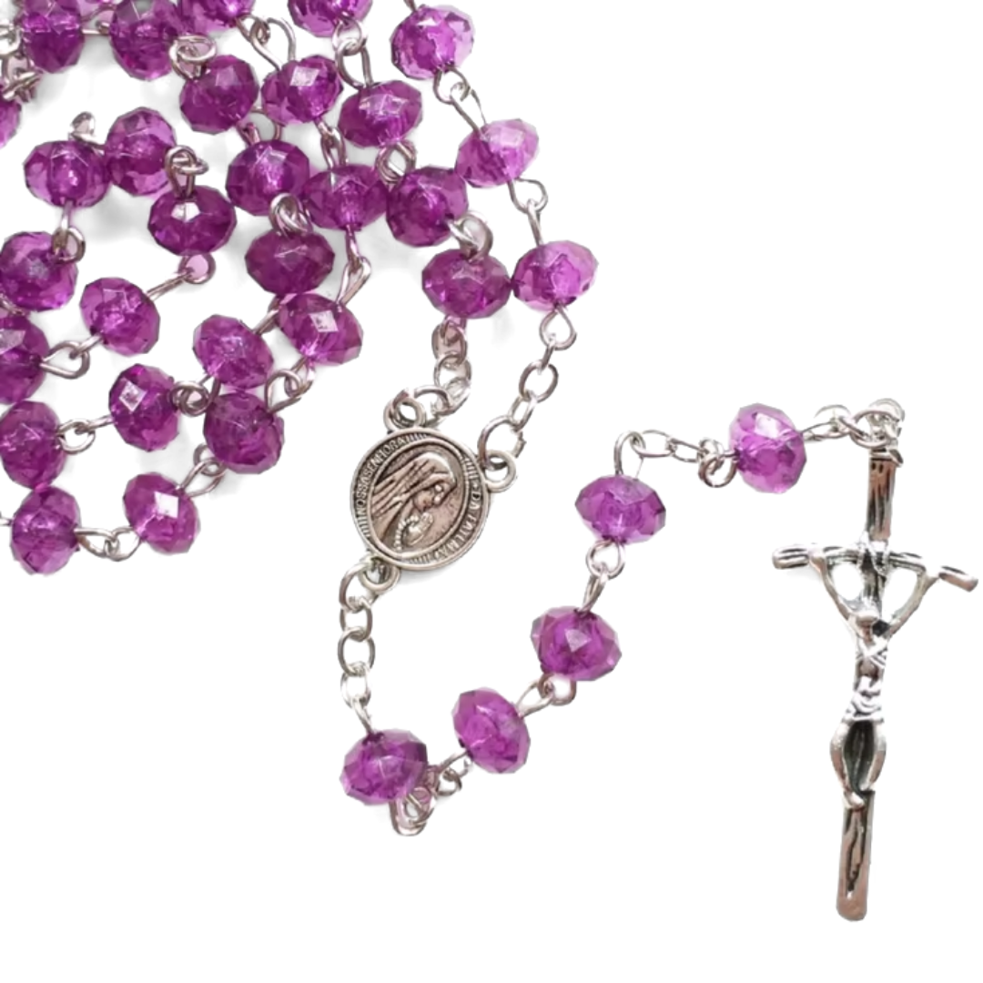 This beautiful Amethyst Crystal Rosary combines elegance and devotion, featuring shimmering faceted beads in a rich purple hue. Connected by silver-toned links, the rosary includes a delicately crafted crucifix and a Virgin Mary centerpiece, making it both a spiritual tool and a stunning accessory. Perfect for prayer, meditation, or as a meaningful keepsake, this rosary inspires faith, tranquility, and spiritual connection.