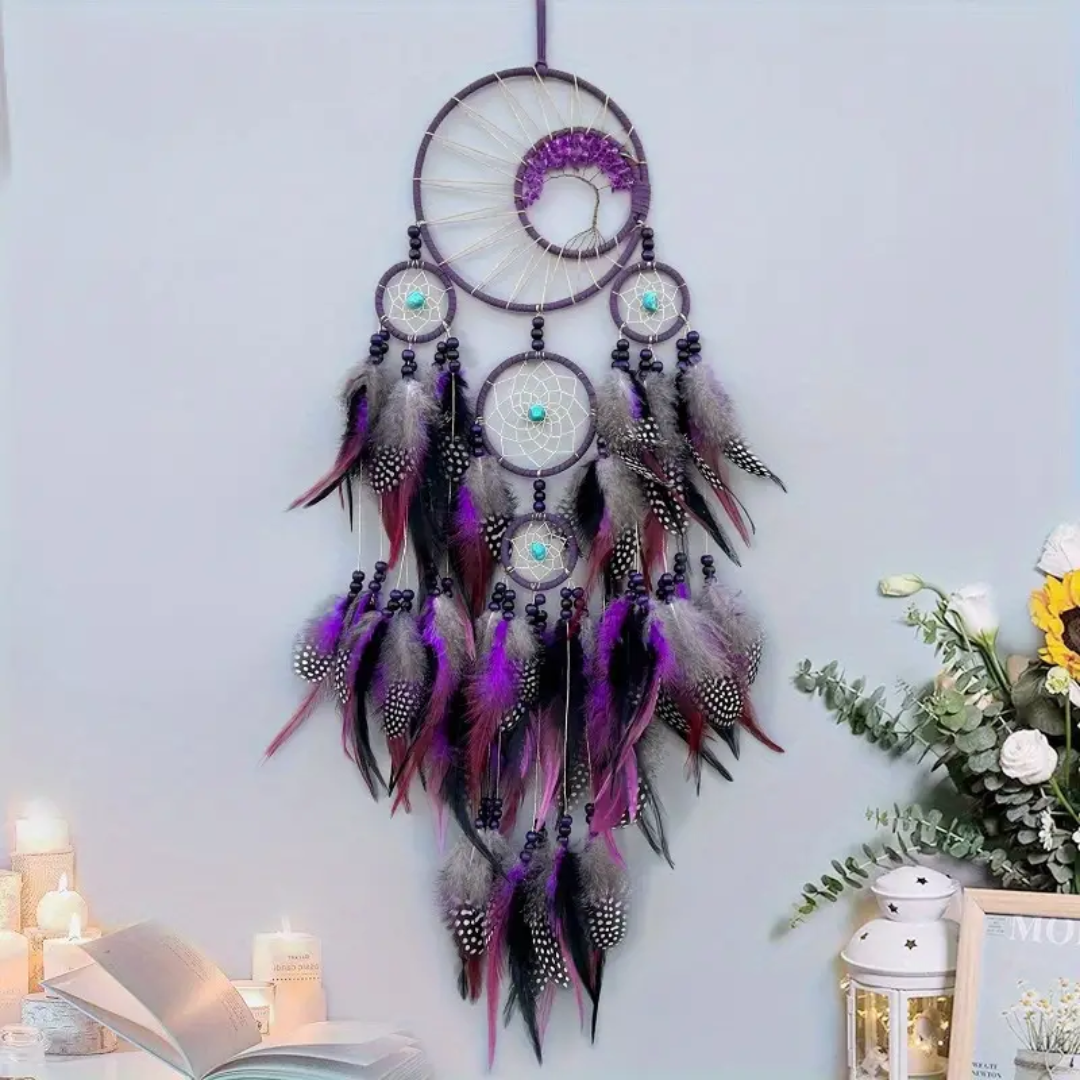 Each strand of feathers dances with the energy of the night, gently swaying to clear away nightmares and unsettling thoughts. The vibrant purples and violets represent spiritual insight, while the black feathers embody grounding and protection, ensuring you remain tethered to the earth as you explore the astral plane.