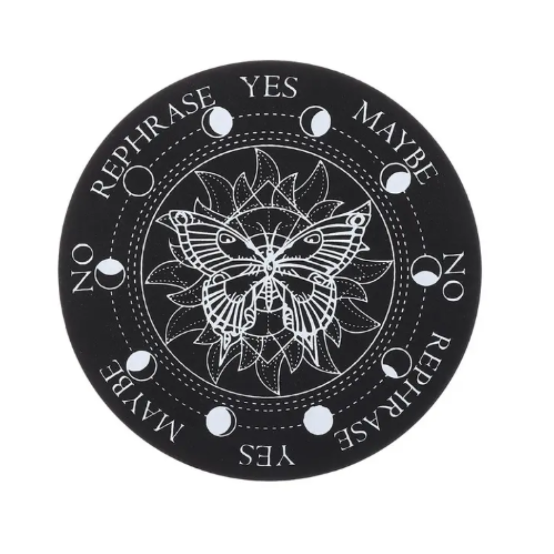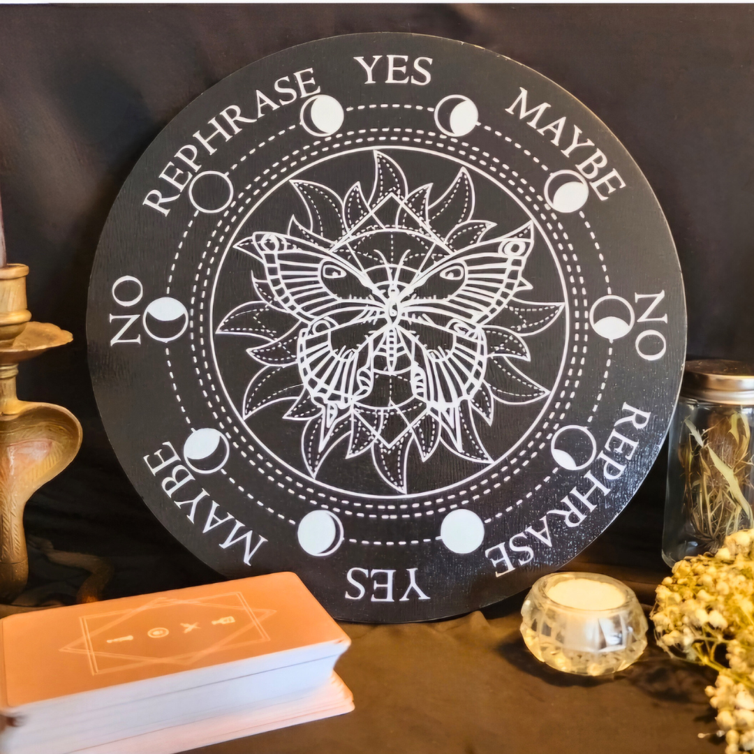 Design: The central butterfly symbolizes transformation, balance, and spiritual evolution, while the lunar phases enhance your connection to intuitive cycles. Clear directional markers—"Yes," "No," "Maybe," and "Rephrase"—help guide your pendulum readings with precision.