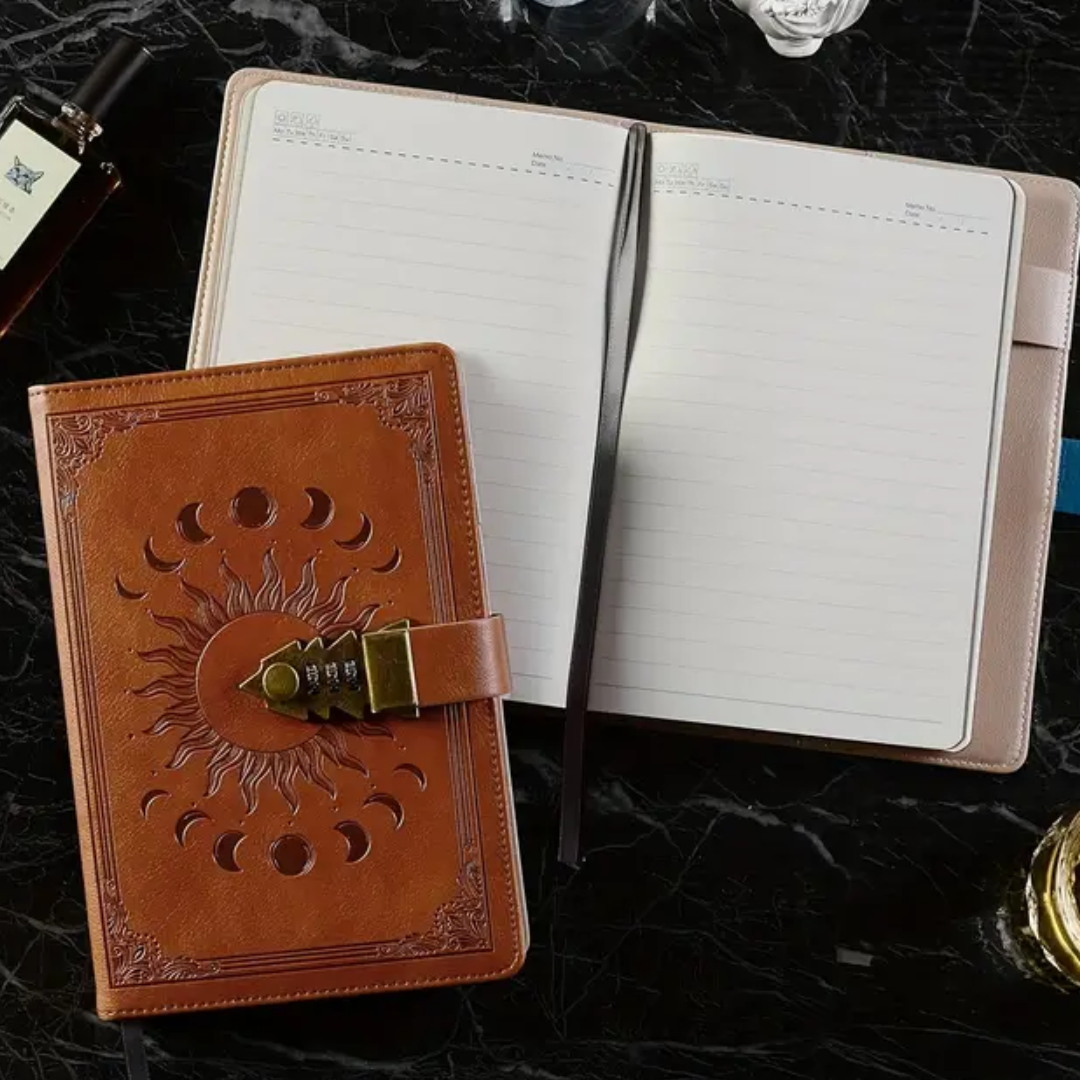 Safeguard your thoughts, dreams, and cosmic revelations within the Celestial Secrets Locking Journal. Wrapped in rich faux leather, its cover features an enchanting embossed design of a radiant sun encircled by the moon phases, symbolizing the eternal dance of time, energy, and transformation. The antique bronze combination lock and matching hardware add an air of mystique, ensuring your most sacred musings remain protected.