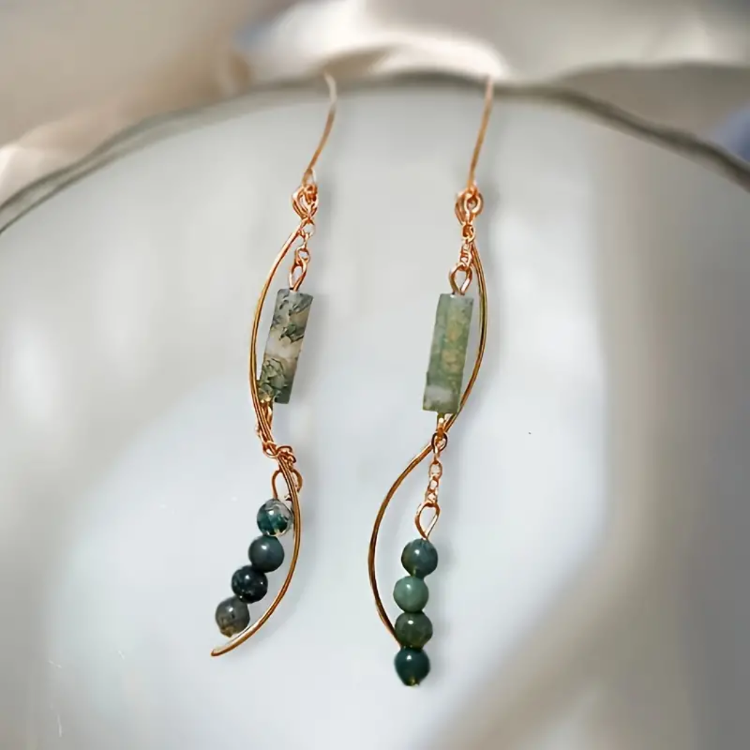 The "Forest Whisper Earrings" are a harmonious blend of natural energies and elegant design. Featuring moss agate gemstones and gold-tone swirls, these earrings channel the essence of the Earth’s vitality. Moss agate is known as a stone of abundance, grounding, and spiritual growth, believed to deepen the connection to nature while fostering balance and tranquility. The gracefully curved metal frame evokes flowing energy, symbolizing harmony and infinite possibilities. Perfect for seekers of inner peace, abundance, and alignment with the rhythms of nature, these earrings are a wearable token of Earth's grounding magic.