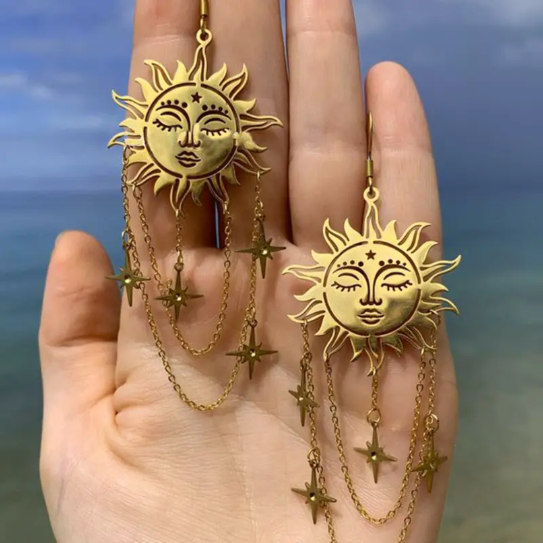 Awaken your inner cosmic energy with these ethereal Bohemian Sun and Star Earrings, a celestial fusion of light and magic. At the center, a golden sun radiates with warmth and vitality, symbolizing power, clarity, and life force. Suspended from delicate chains, vintage-inspired starbursts twinkle like guiding lights in the night sky, representing hope, intuition, and divine connection. These earrings dance with every movement, creating a mesmerizing flow of cosmic energy. Perfect for star-gazers and sun worshippers alike, they serve as a reminder to shine your light boldly and trust in the guidance of the universe.
