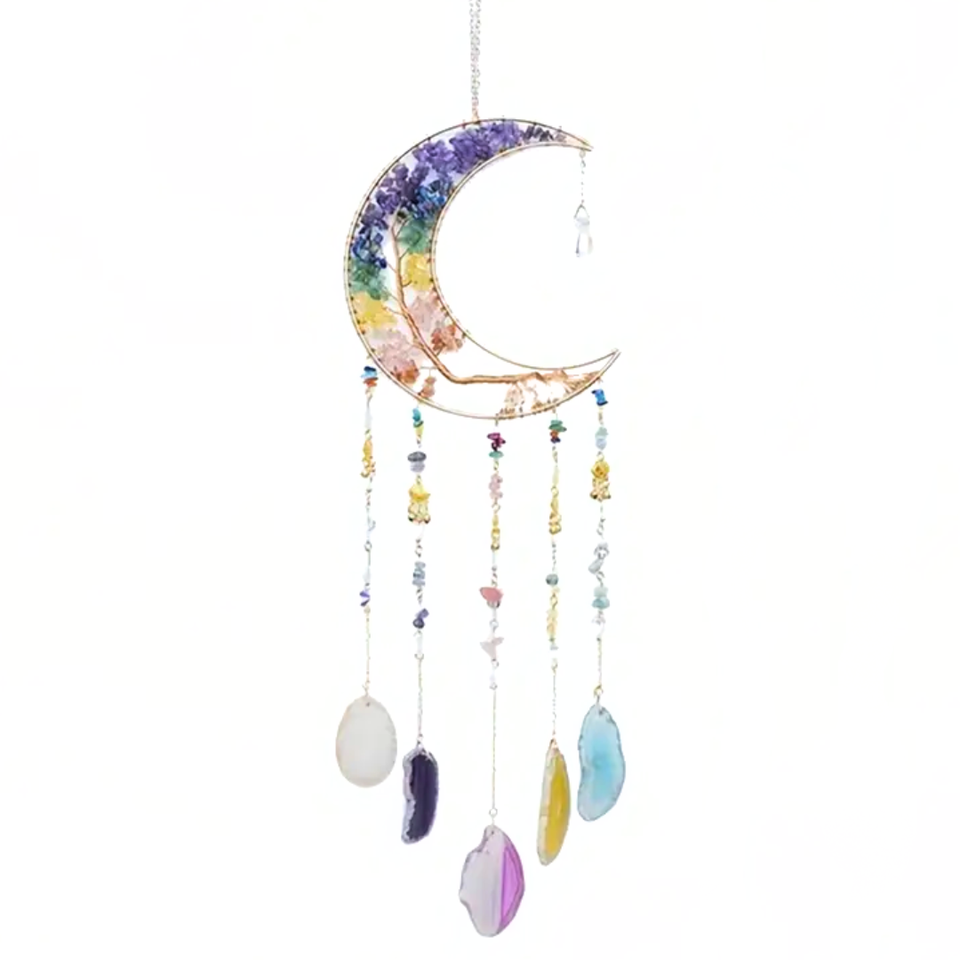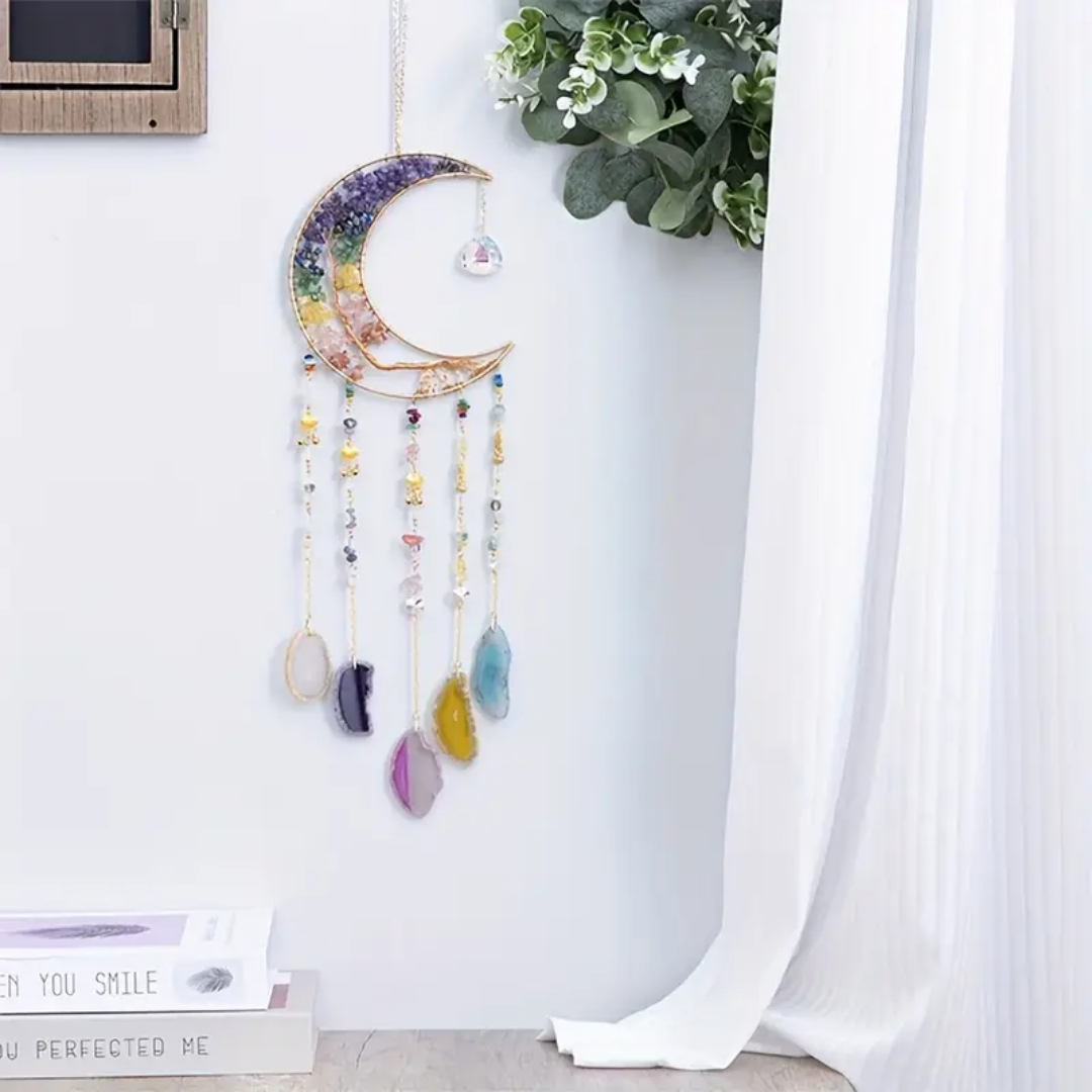 Five delicate chains dangle gracefully from the moon, each adorned with scattered crystal chips that shimmer in the light, resembling stars in the night sky. At the end of each chain, a smooth agate stone hangs, adding earthy grounding energy and creating a soft, melodic sound in the breeze.