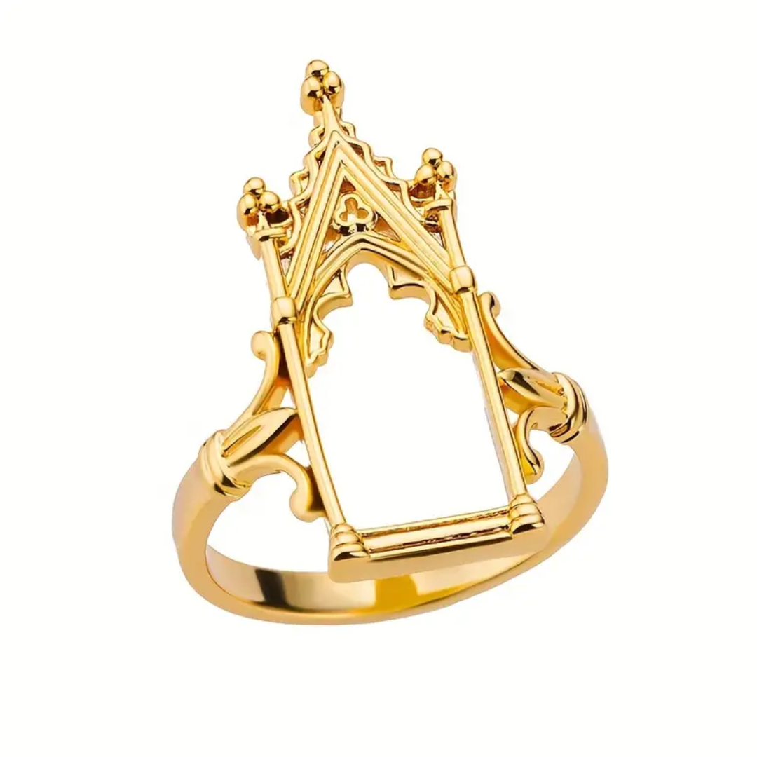 Channel the grandeur of gothic architecture with these 18k gold-plated Cathedral Rings. Inspired by the towering arches and intricate designs of medieval cathedrals, these rings feature an openwork structure, evoking the mystical essence of sacred spaces. The pointed arch and delicate detailing create a mesmerizing frame, reminiscent of stained glass windows, allowing light to pass through as if revealing a portal to another realm. Available in both gold and silver tones, these rings are a striking blend of ancient artistry and modern elegance, perfect for those who seek to wear a symbol of divine beauty and timeless craftsmanship.