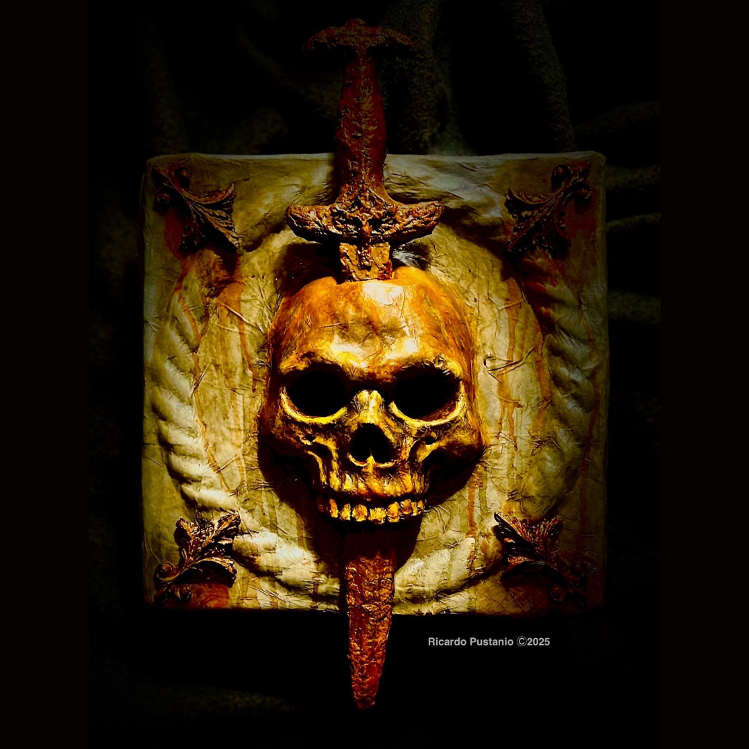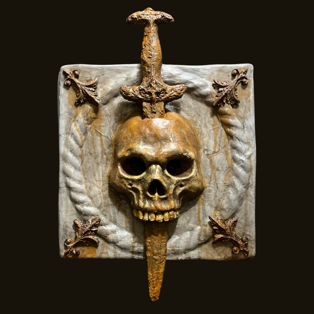This masterfully sculpted wall plaque by Ricardo Pustanio is titled "La Puerta del Silencio"—The Gate of Silence. A skull emerges from the center of a weathered stone-like field, pierced vertically by a ritual blade. Encircled by a textured wreath and crowned at each corner with fleur-de-lis motifs, the piece evokes sacred stillness, ancestral protection, and the moment of irreversible transformation.
