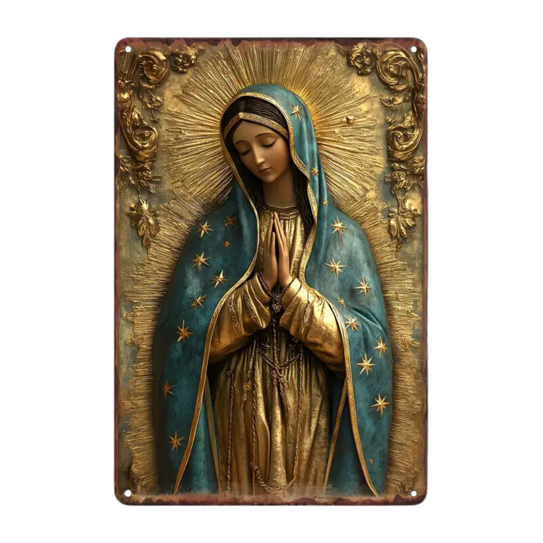 Bring the beauty and serenity of Our Lady of Guadalupe into your space with this stunning 12" tall x 8" wide wall sign. Crafted from durable aluminum, it features a high-quality 2D image of the Blessed Virgin Mary, adorned in her iconic blue mantle with golden stars, radiating divine light and peace. The intricate details of this artwork capture her gentle expression and sacred presence, making it an inspiring addition to any home or sacred space.