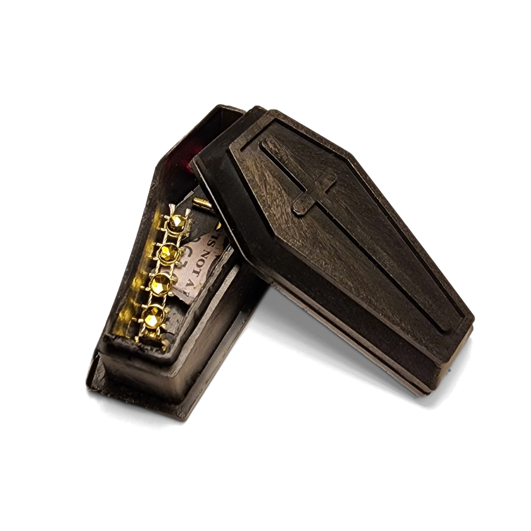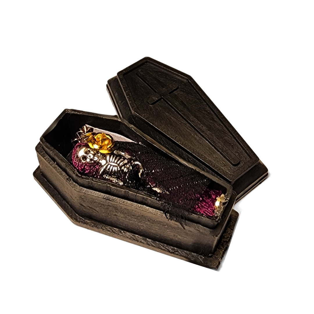 Our La Santa Muerte Mini Travel Altar is handmade with intention, perfect for honoring La Flaquita wherever you go. Each altar is housed in a 4" black coffin and includes a handcrafted mini Santa Muerte figure and symbolic items like charms or offerings.