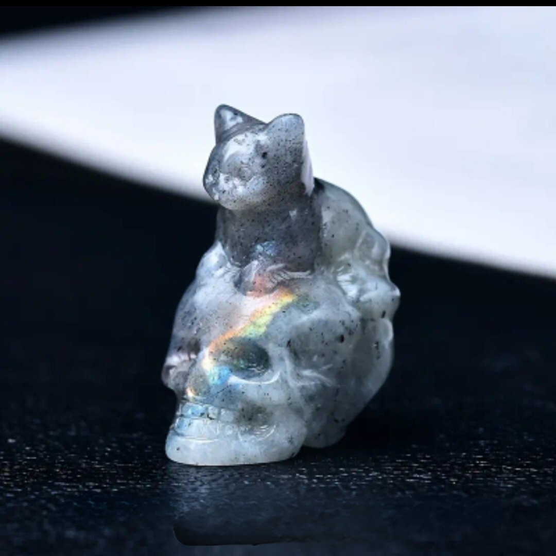 Labradorite Skull with Cat, Natural Quartz Crystal