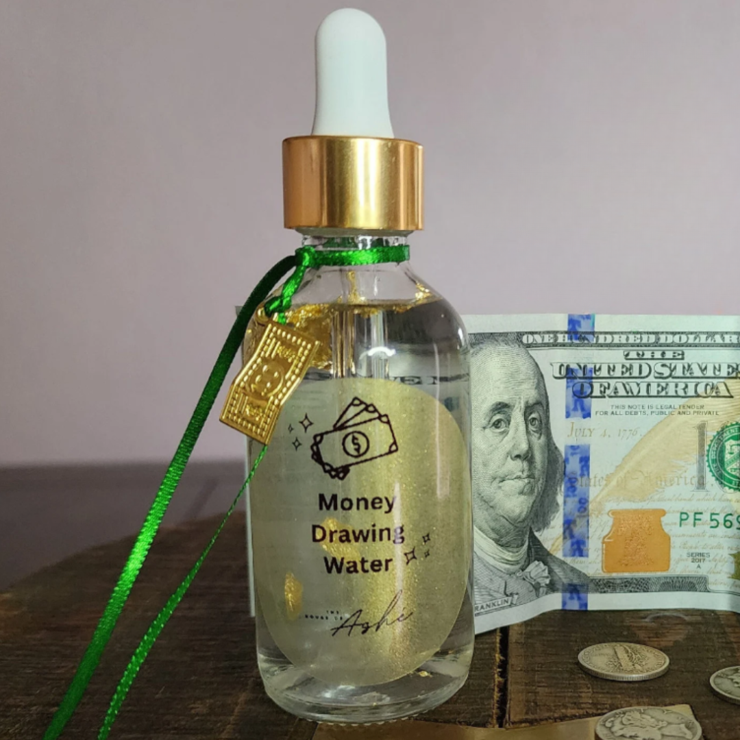 The House of Ashé Money Drawing Water is a powerful, handcrafted proprietary blend designed to attract abundance, prosperity, and financial success. Infused with Mercury Dimes, dressed with gold leaf, and prepared through 3 days of rigorous ritual and prayer, The House of Ashé Money Drawing Water is created with intention and infused with spiritual energy, this water embodies the essence of Ashé—the divine life force that flows through all things.