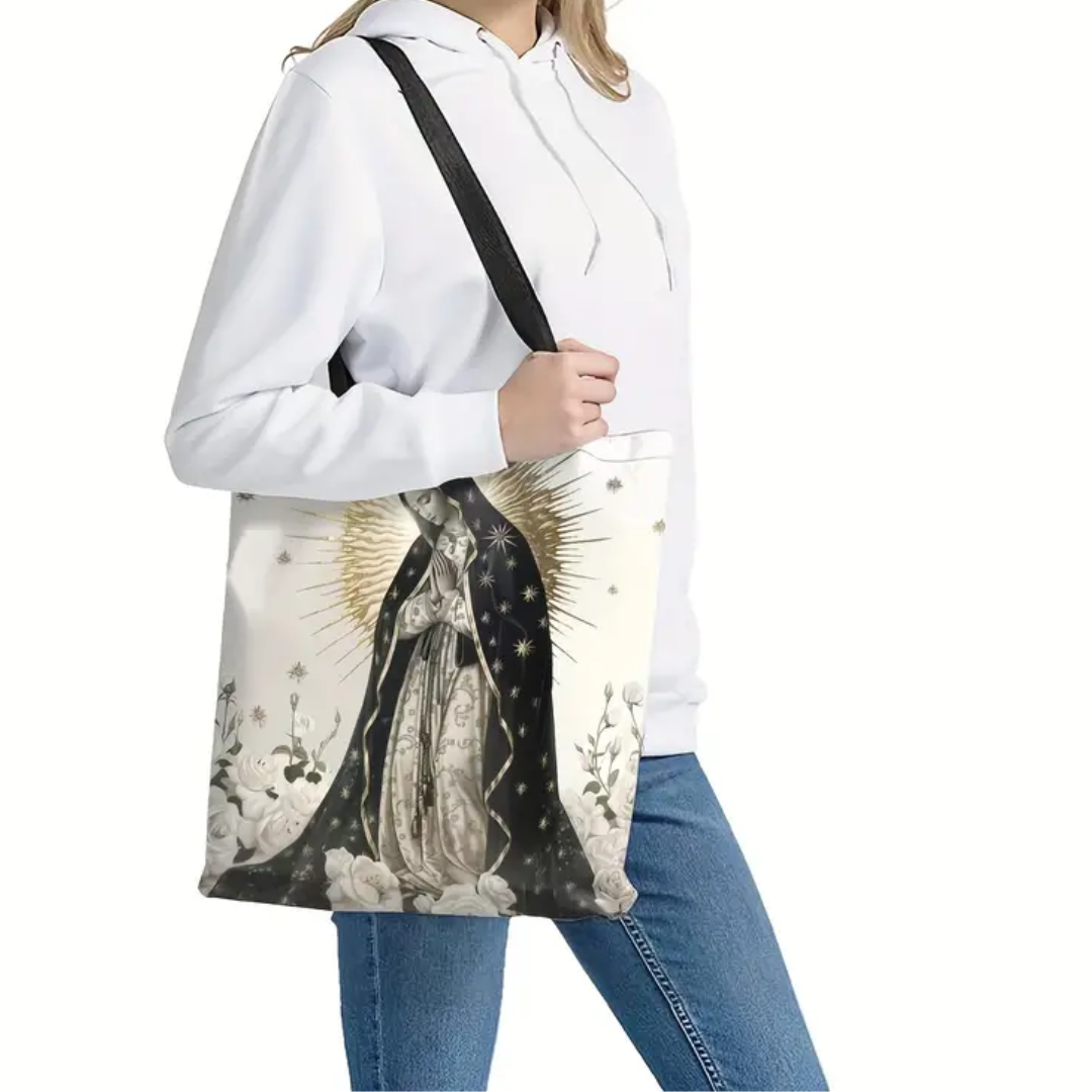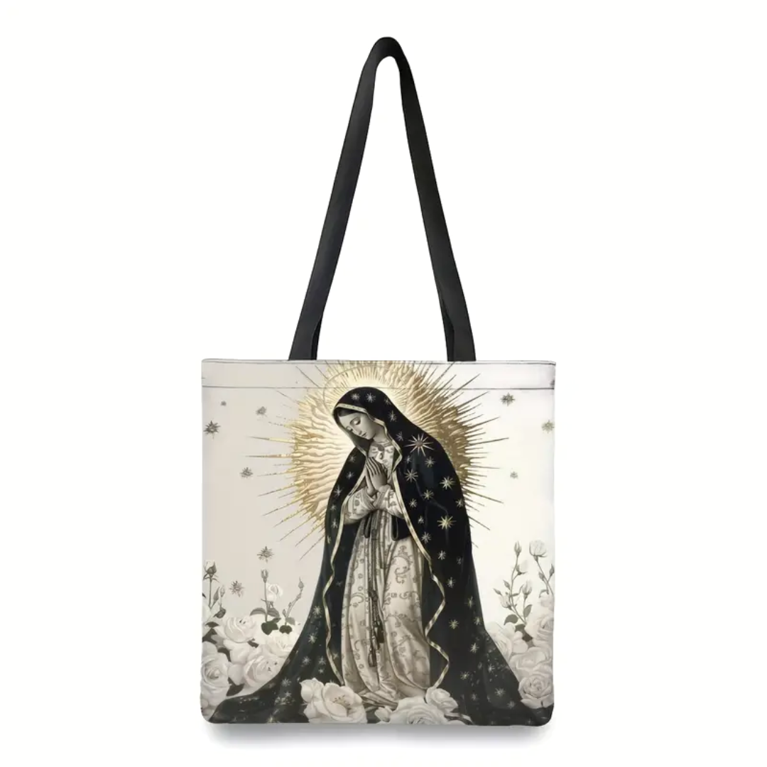 Honor faith and beauty with the *Our Lady of Grace* canvas tote bag, showcasing a stunning depiction of the Virgin Mary draped in a celestial, star-studded cloak. Surrounded by a radiant golden aura and delicate white roses, this design captures her timeless grace, devotion, and serenity.