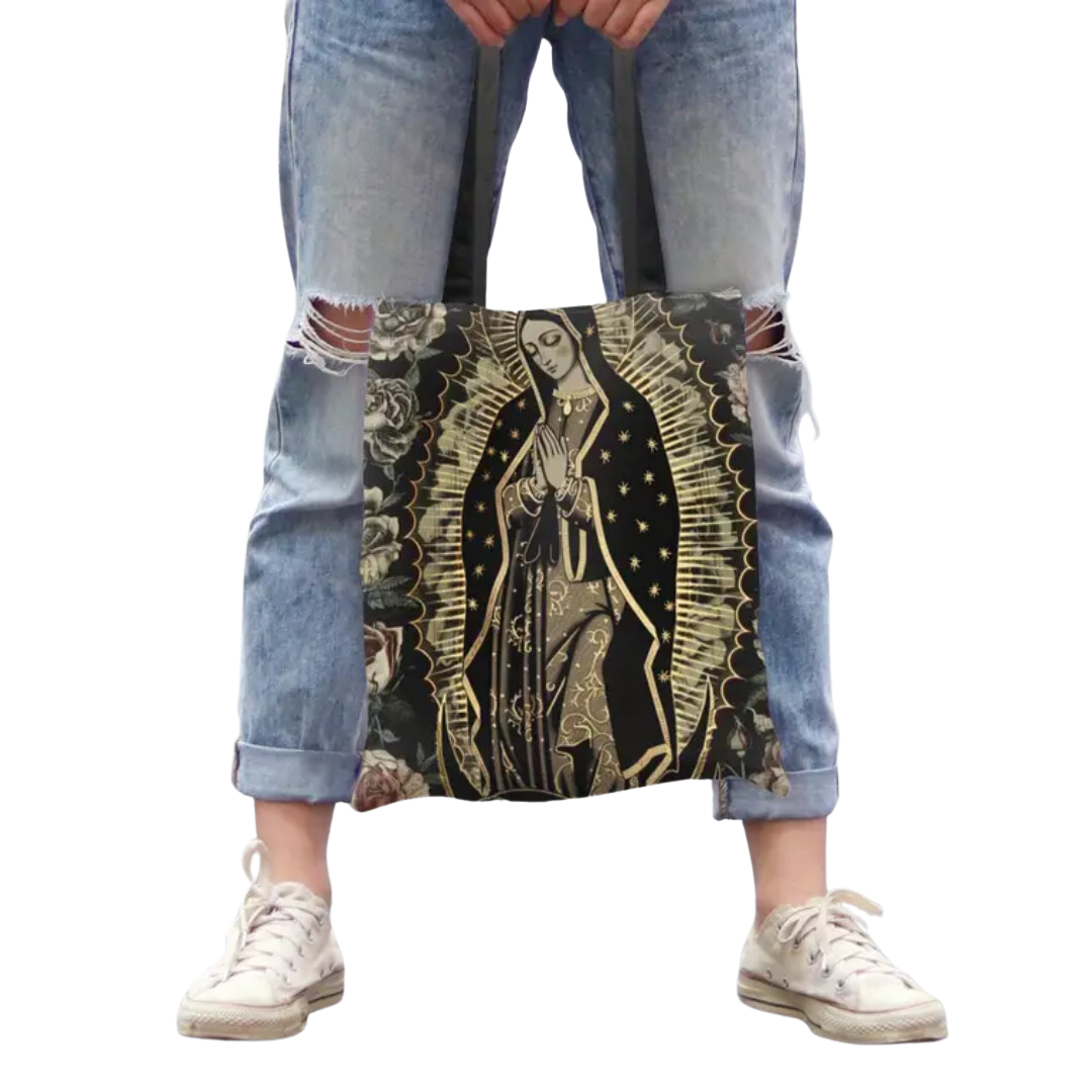 This beautiful tote bag features a striking design inspired by Our Lady of Guadalupe. The dark-toned illustration depicts the Virgin Mary with intricate gold accents, symbolizing reverence and grace. The floral details surrounding her image add a touch of elegance and depth, making this bag a stylish yet meaningful accessory. Made with durable material and comfortable black straps, it’s perfect for carrying books, groceries, or everyday essentials while showcasing a piece of timeless artistry.
