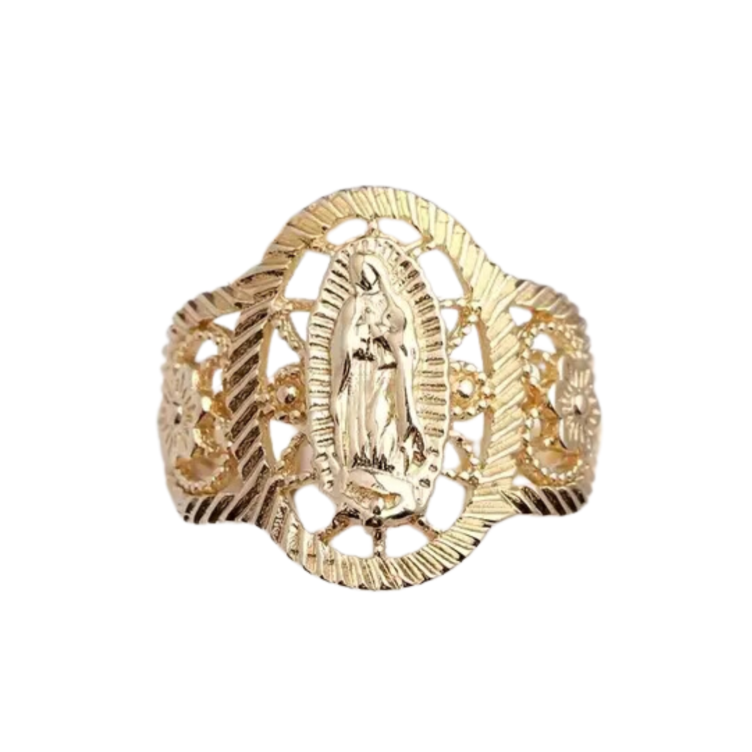 Celebrate your faith and devotion with this Our Lady of Guadalupe Ring, a beautifully designed piece featuring the image of Mary Guadalupe at its center. Crafted from durable gold-plated alloy, this ring is adorned with intricate floral cutouts and a radiant oval border, making it a striking and meaningful accessory.