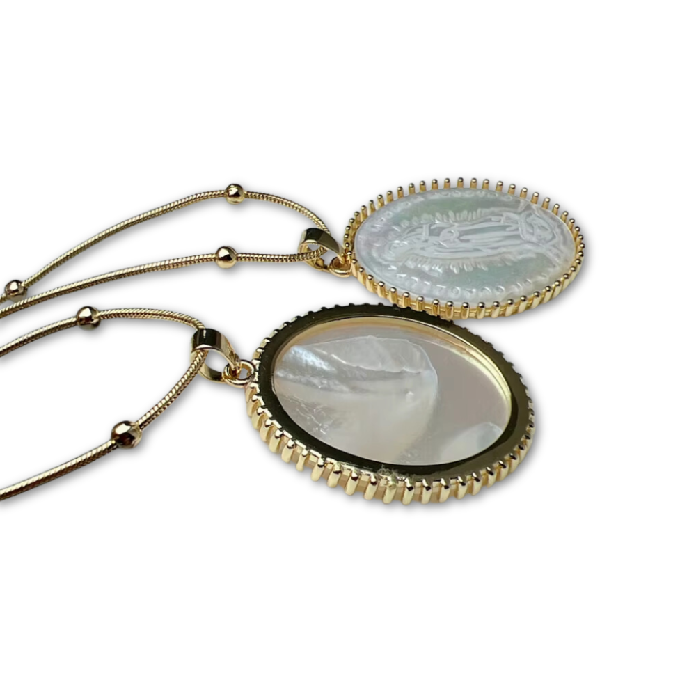 This exquisite Our Lady of Guadalupe Necklace features a beautifully detailed image of Mary Guadalupe engraved on a natural shell pendant. The iridescent glow of the shell adds an ethereal beauty to the piece, highlighting its spiritual significance. Encased in a delicate gold-tone border, this pendant is a timeless symbol of faith and devotion.