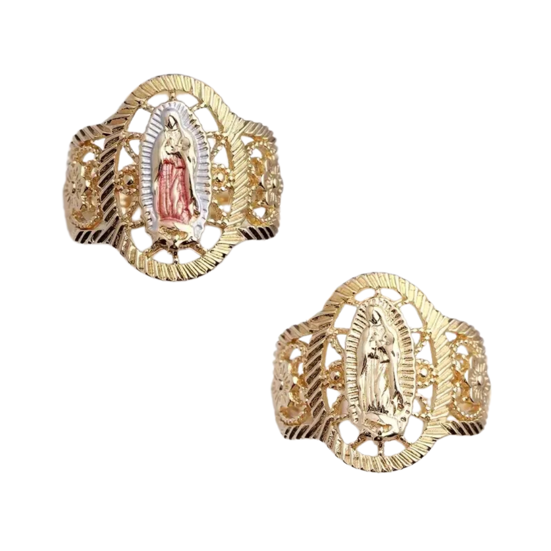 Celebrate your faith and devotion with this Our Lady of Guadalupe Ring, a beautifully designed piece featuring the image of Mary Guadalupe at its center. Crafted from durable gold-plated alloy, this ring is adorned with intricate floral cutouts and a radiant oval border, making it a striking and meaningful accessory.