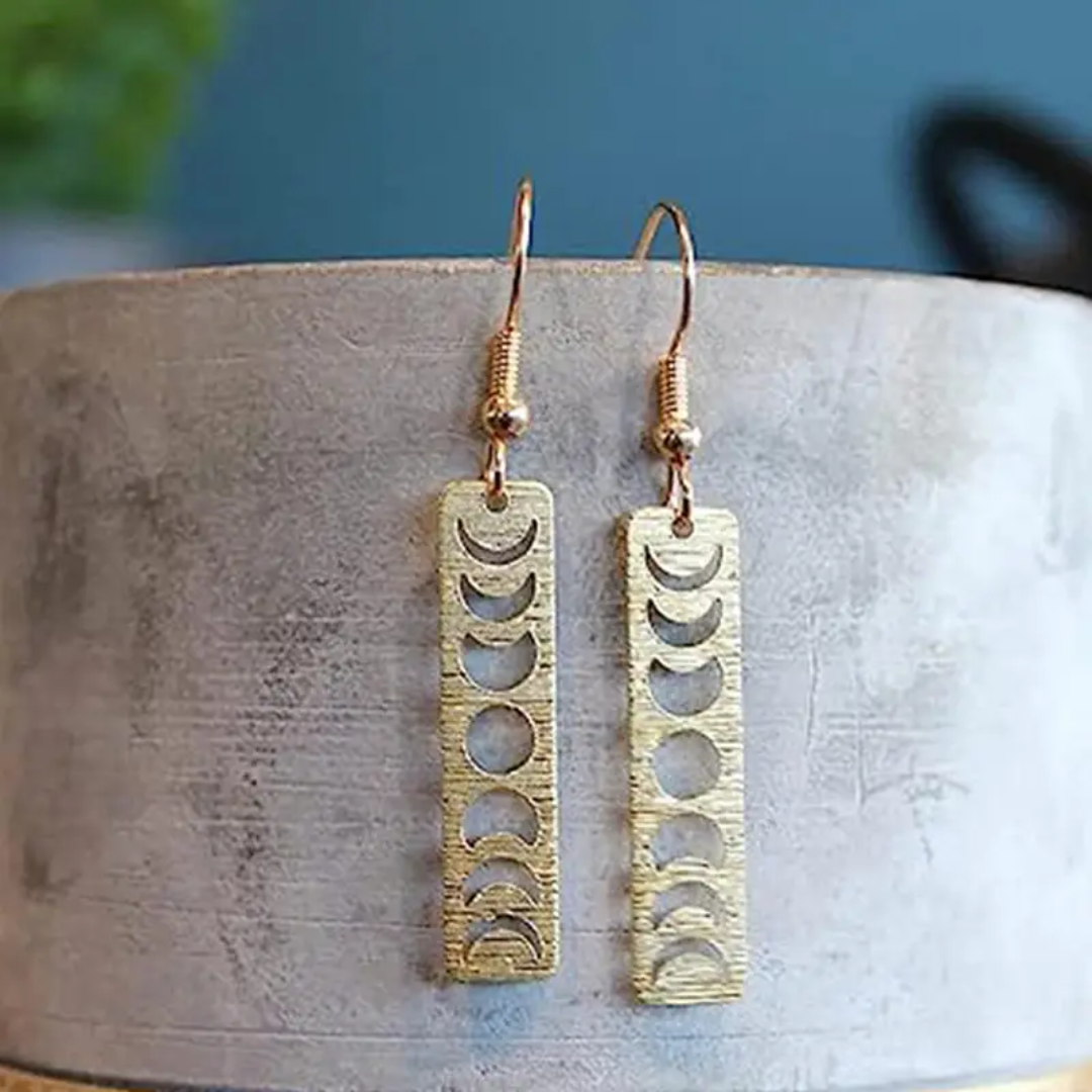 The Celestial Cycle Earrings capture the ethereal dance of the moon, elegantly etched into a sleek gold-toned bar. These dangle earrings feature the phases of the moon cut out along the bar, symbolizing growth, renewal, and transformation. Though not crafted from real gold, their radiant finish reflects the enduring beauty and mystique of the lunar cycle.