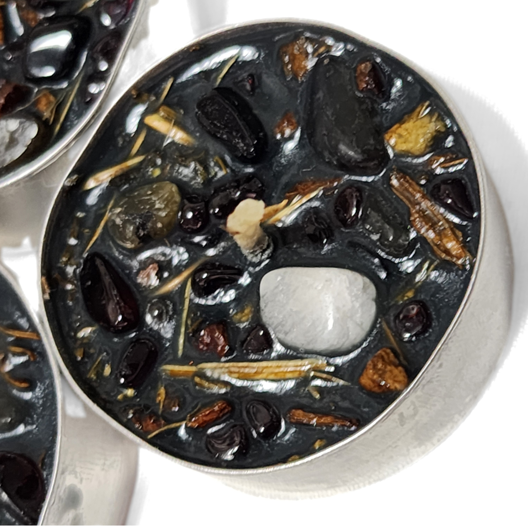 The Protection Prepared Tea Light, handcrafted by The House of Ashé, is a potent spiritual tool designed to fortify your energy and space. This black tea light is infused with a warm, semi-sweet aroma, creating a calming and protective ambiance. Carefully dressed with obsidian, red jasper, moonstone, garnet, and a blend of sacred herbs, it is specifically crafted to dispel negativity, promote grounding, and invite divine protection.