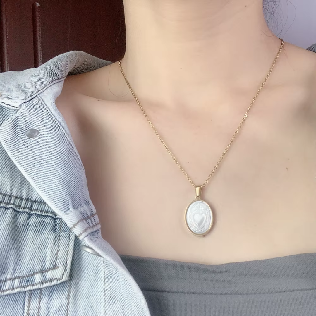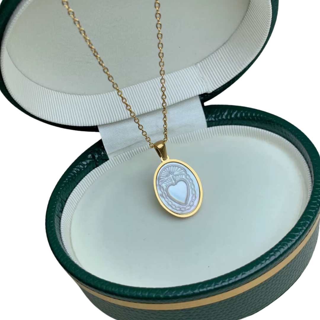 This elegant Sacred Heart Necklace combines timeless beauty with spiritual significance. Featuring a delicate charm crafted from natural shell, engraved with the image of the Sacred Heart, and set in gold-plated stainless steel, this piece is a meaningful expression of faith and devotion. The soft iridescence of the shell adds a unique and luminous quality to the pendant, making it both sacred and stylish.