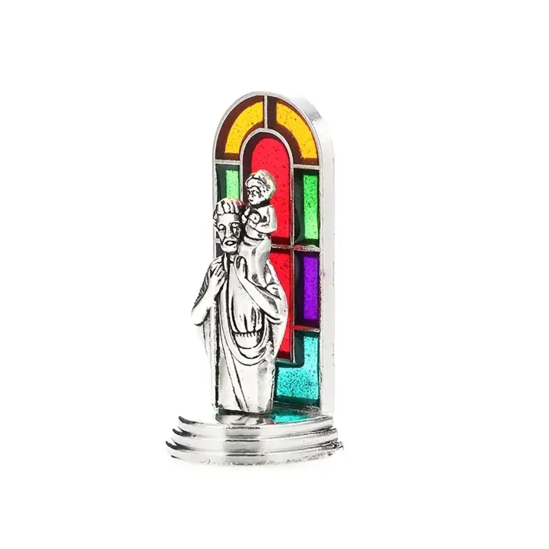 This elegant Saint Christopher Stained Glass Dashboard Saint stands at 1.77" tall by 0.7" wide, featuring a silver-tone figure of Saint Christopher, the patron saint of travelers, against a radiant, multicolored stained glass background. Compact and beautifully designed, this piece brings spiritual protection and inspiration wherever you go.