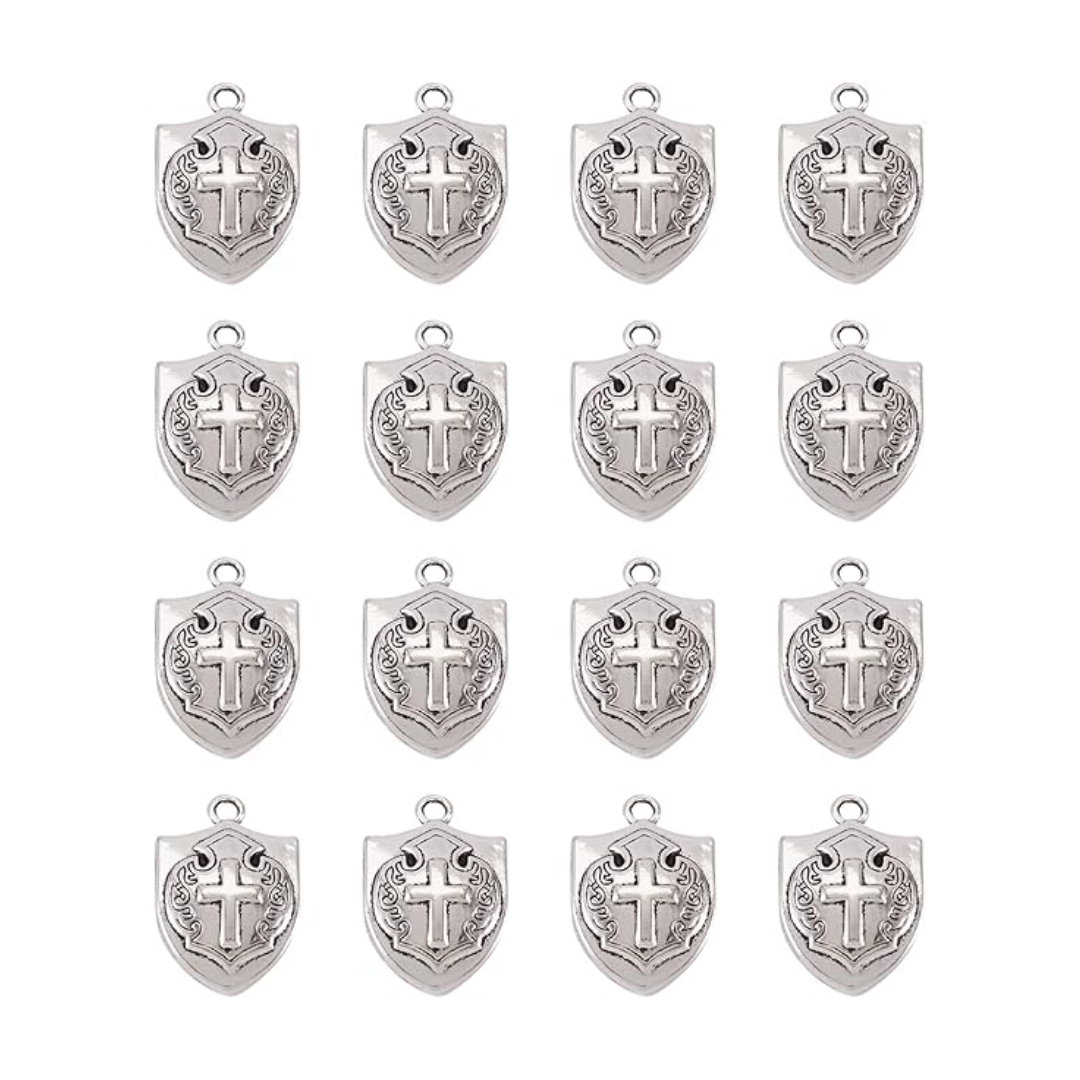 This intricately crafted shield charm, adorned with a cross motif and swirling designs, symbolizes divine protection, strength, and spiritual defense. Its antique silver tone gives it a timeless elegance, making it a perfect talisman for those seeking protection and guidance on their spiritual journey.