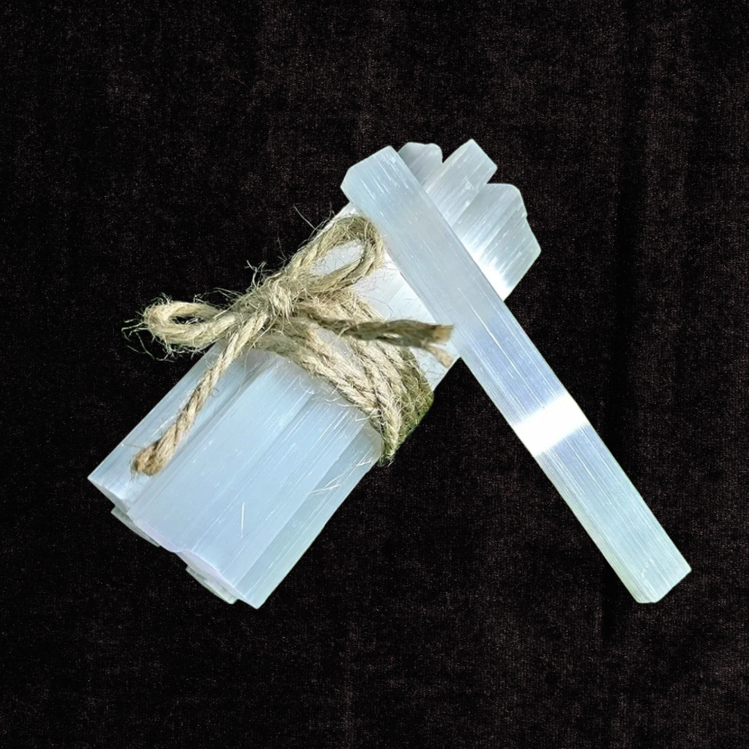 Selenite mini sticks / mini energy wands. Selenite is a high vibrating stone that connects us powerfully with the upper chakras. Selenite may assist with protection, good luck, charging other crystals around it, and it can clean, clear and open all chakras. Keep one of these handy and use like a wand to trace your body for a quick energy clearing!