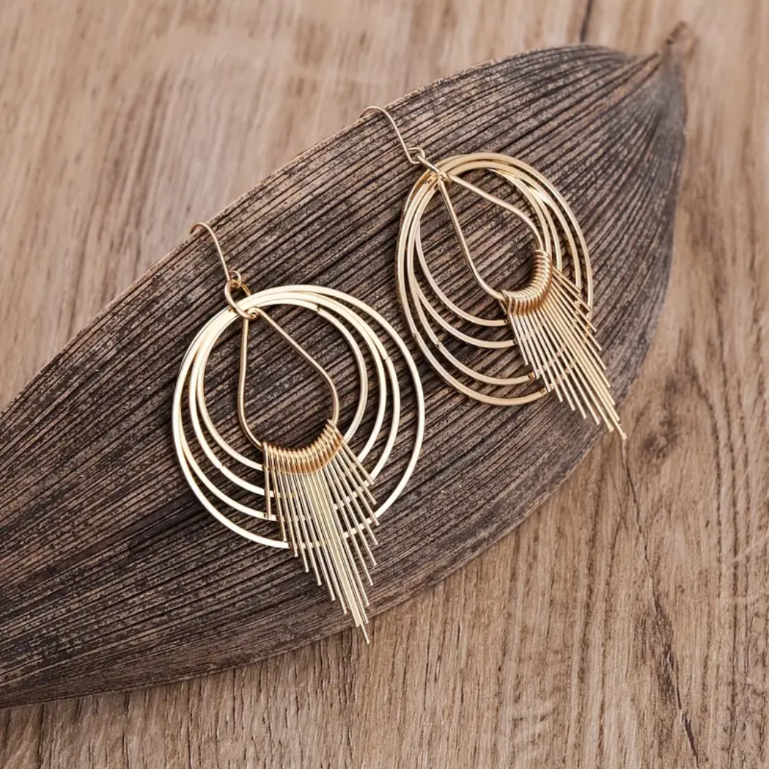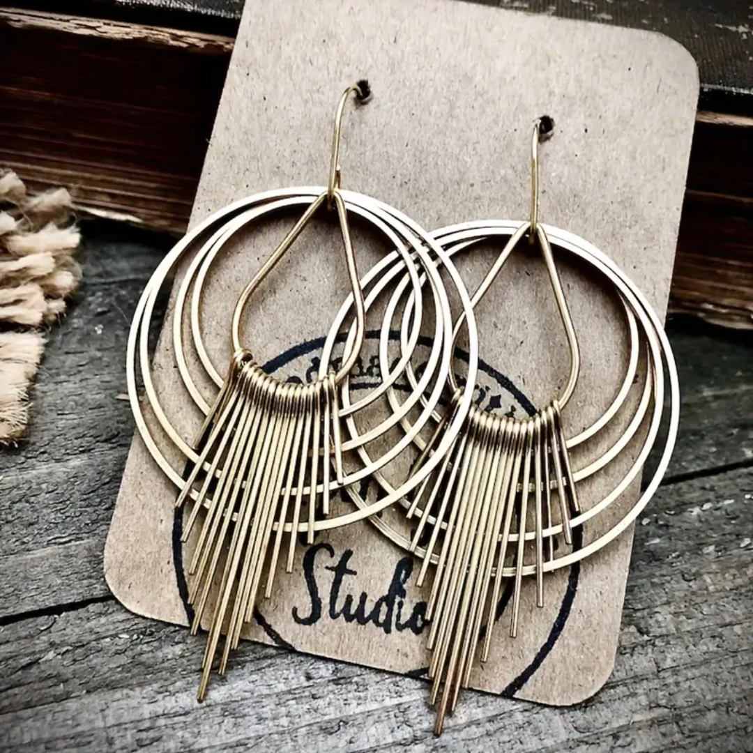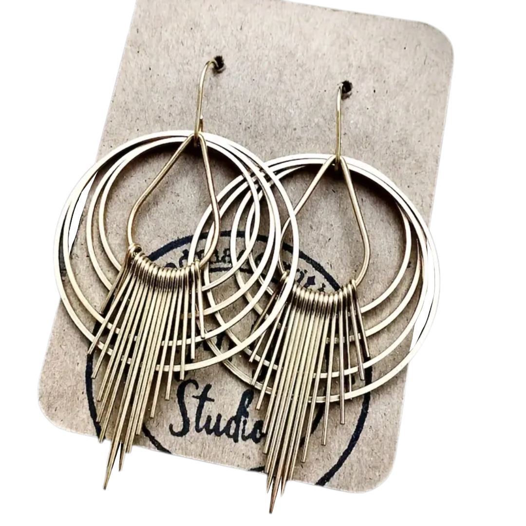 The Solar Flare Earrings captivate with their dynamic, layered design, inspired by the brilliance and energy of the sun’s rays. Crafted in gold-tone metal, these earrings feature concentric hoops that create a sense of movement, while delicate, cascading metal spikes radiate from the center, resembling sunbursts or solar flares in motion.