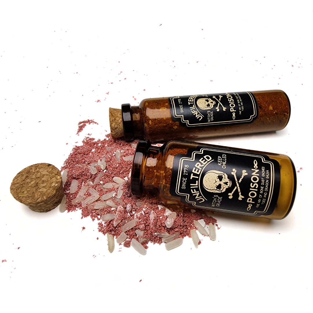 A fine and fearsome blend of bone dust, gnome toes, and dragon saliva—this tongue-in-cheek curio is perfect for witches with a sense of humor and a flair for the dramatic. Traditionally used in baneful magic, boundary-setting, and reversal work, this “Poison” jar makes a wickedly fun addition to your spell shelf.