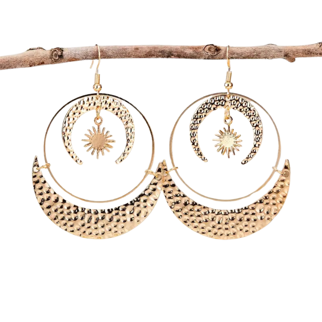 The Lunar Radiance Earrings blend the mystique of the moon with the brilliance of the sun, creating a stunning celestial statement. Crafted in hammered gold-tone metal, these earrings feature a layered design of crescent moons, solar bursts, and circular hoops, symbolizing the eternal dance between day and night.