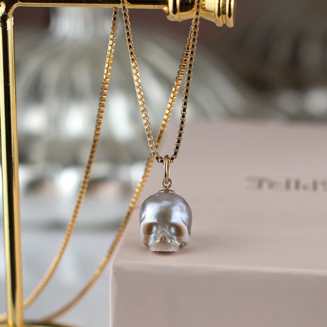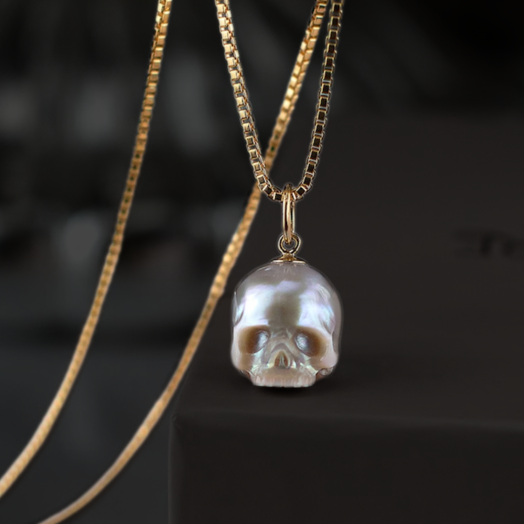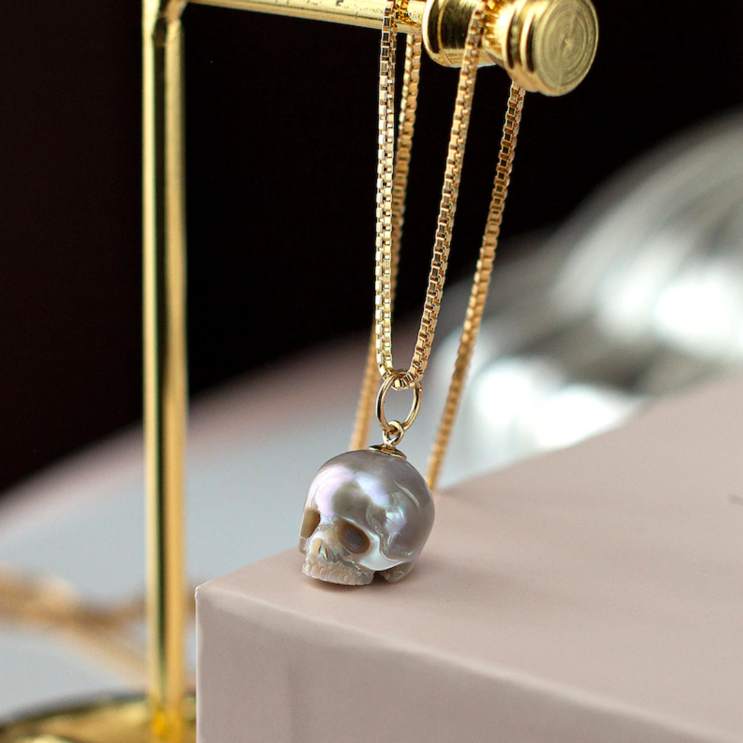 Spirit Talisman Imitation Grey Pearl Skull Necklace with 14k gold plated box chain