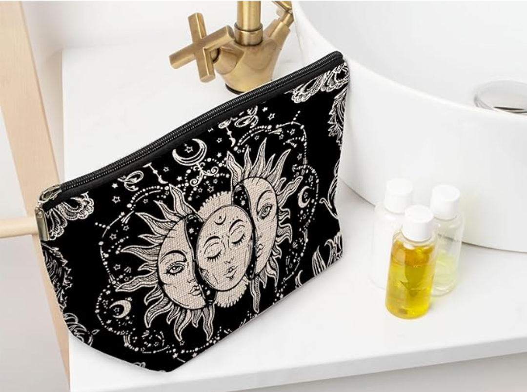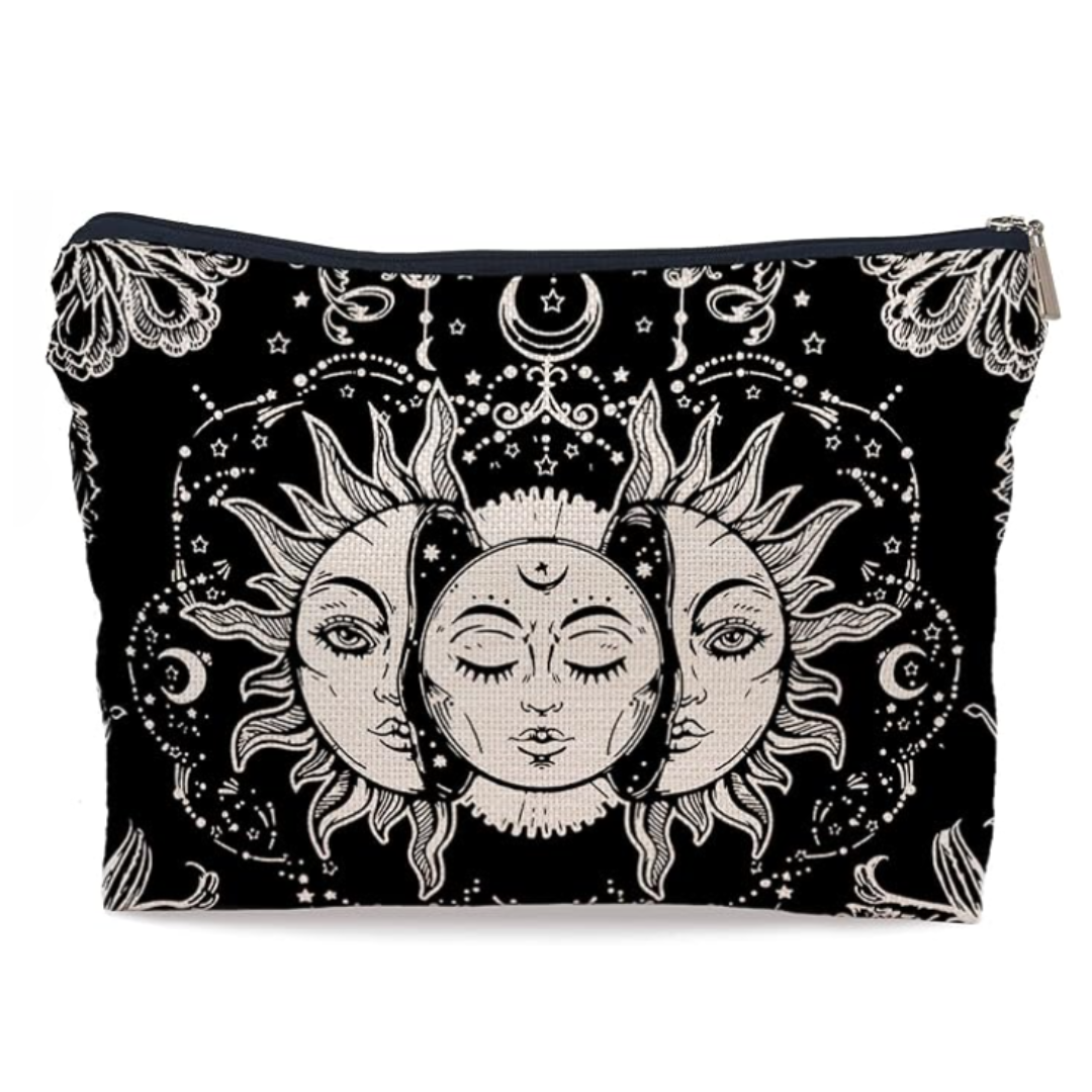 Roomy travel zipper cosmetic pouch. Double sided print, lightweight toiletry organizer with liner