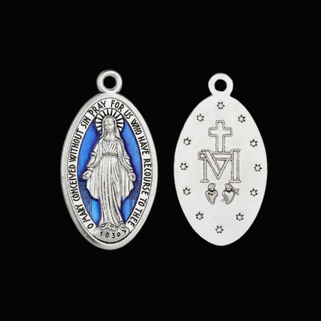 Beautiful Blue Enamel Virgin Mary Miraculous Medal inscribed with "O Mary Conceived Without Sin Pray for Us Who Have Recourse to Thee"