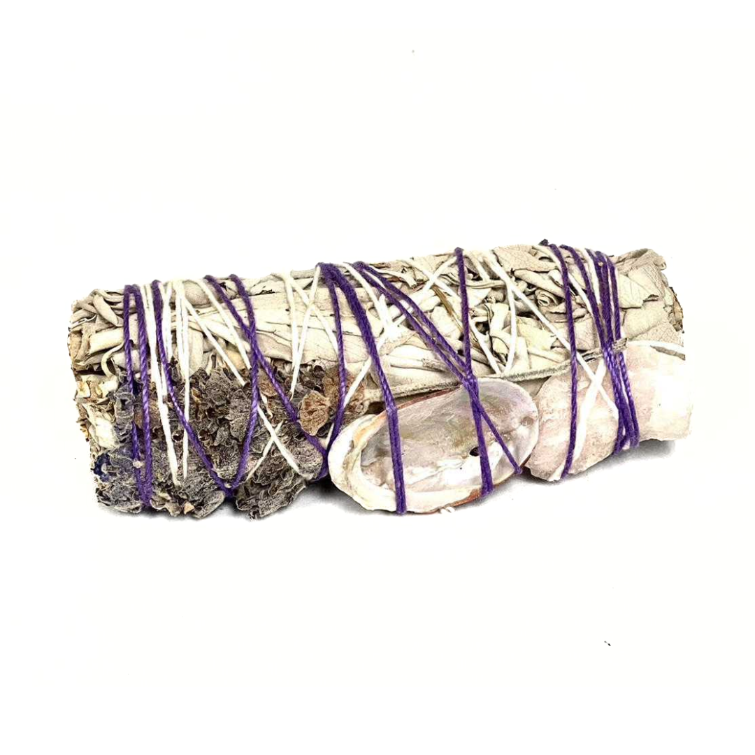 White Sage, Lavender, Mini Red Abalone, Pink Quartz, Stick Lentisco Smudge Bundle 4"